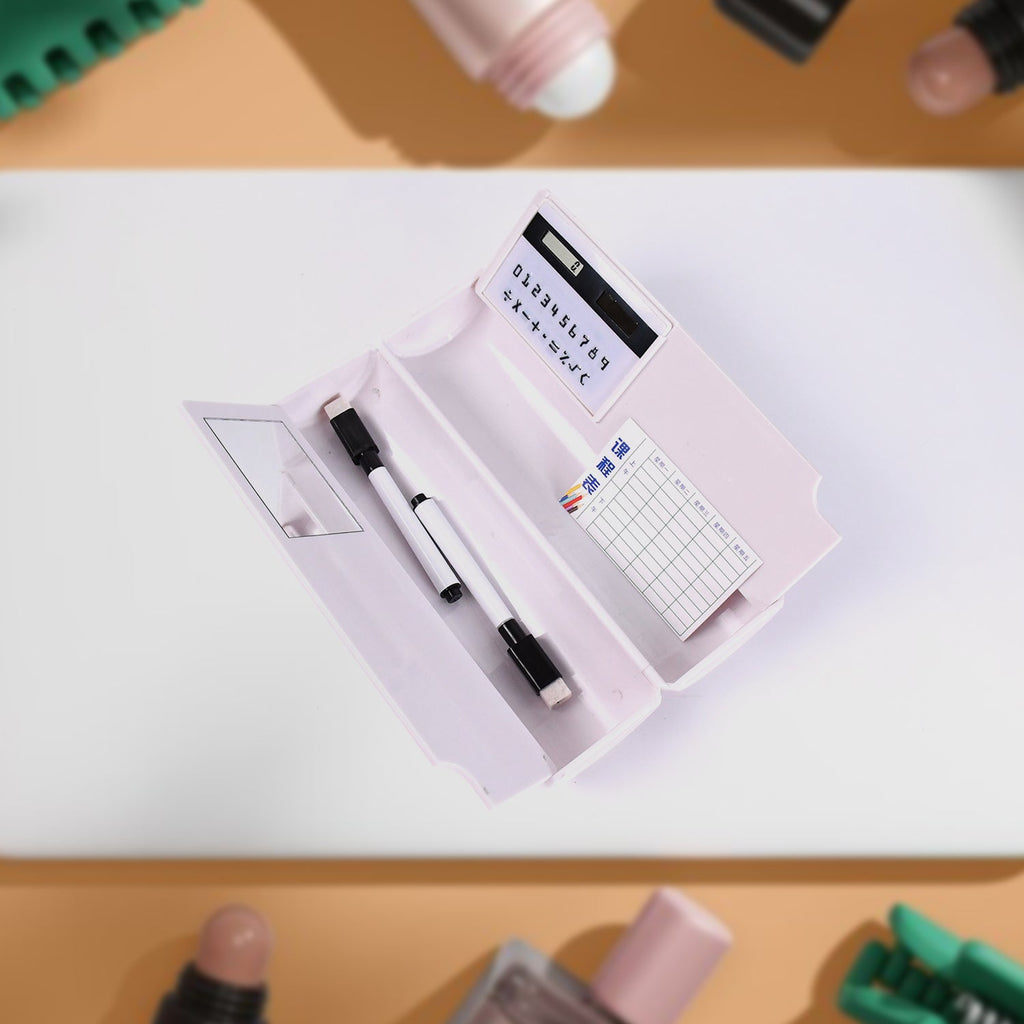 17609 8 in 1 Compass Box, Geometry Box 2 Compartment, Pencil Box with 1 Calculator, 1 Mirror, 2 in 1 Marker Pen With Eraser for Boys Art Plastic Pencil Box for Girls and Boys